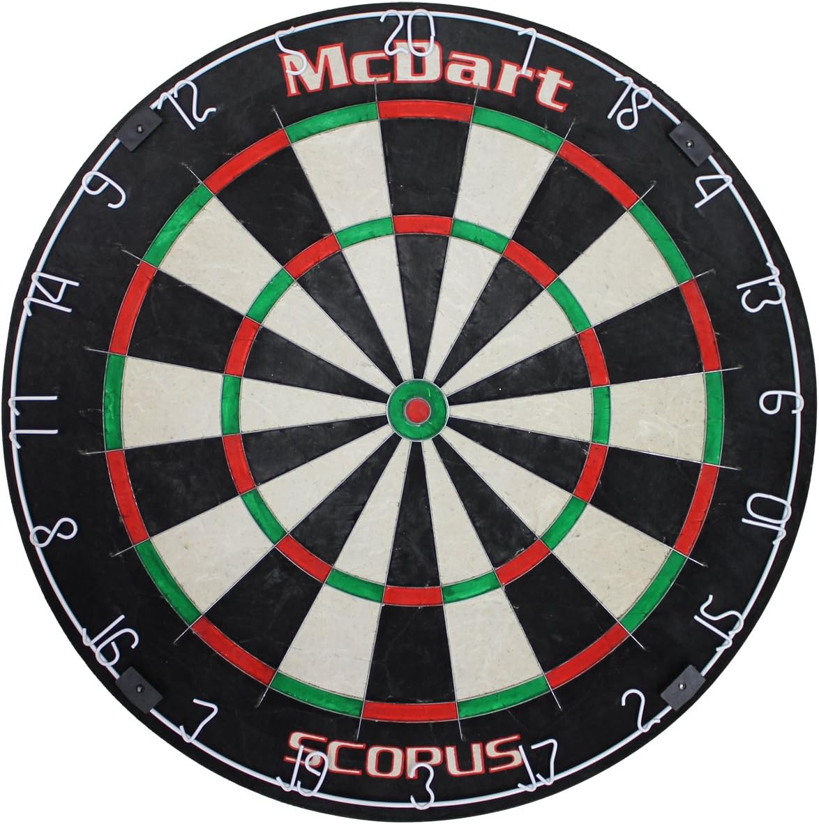Das nächstes Modell McDart Scopus Bundle ist vielen unbekannt, stellt aber einen echten Fund für alle Anfänger dar. Davon zeugt die Tatsache, dass 71 % aktueller Nutzer dieses Steel Dartboard mit 5 Sternen bewerten. Diese Hochschätzung resultiert aus der Tatsache, dass dieses Modell einfach befestigt und benutzt werden kann. Ermöglicht wird das dadurch, dass der Steeldartscheibe eine Gebrauchsanweisung beiliegt, in der Schritt für Schritt erklärt wird, wie das Steel Dartboard zu befestigen ist. Außerdem wird alles Nötige zum Befestigen geliefert, sodass selbst ein Anfänger das Steel Dartboard installieren kann. Dabei liegt es im Ermessen des Käufers, ob er die Steeldartscheibe zu Hause oder draußen befestigt, weil die Konstruktion dieses Modells beides zulässt. Warum aber vergaben 29 % der Nutzer keine 5 Sterne an dieses Steel Dartboard? Es ist ein gutes Board aber die meisten störten die falsch gemalte Ziffern. Doch das ist auch ziemlich das Einzige, was den Nutzern, die keine 5 Sterne vergaben, missfiel. Daher bekam dieses Modell von ihnen in der Regel 4 Sterne. Das ist nicht verwunderlich, wenn man bedenkt, dass es groß genug ist, um selbst Anfängern eine hohe Treffererwartung zu garantieren. Die Stärke des Materials von 5 cm verhindert, dass die Pfeile die Scheibe komplett durchstoßen und die Wand beschädigen. Das Spinnennetz der Scheibe schützt sie selbst vor irreparablen Schäden und verhindert, dass die Darts abprallen. Erreicht wird es dadurch, dass das Netz aus dünnem Draht hergestellt wird. Zusammen mit leichter Abnehmbarkeit machen diese Eigenschaften das vorgestellte Modell ideal für alle Anfänger aber auch Fortgeschrittene.